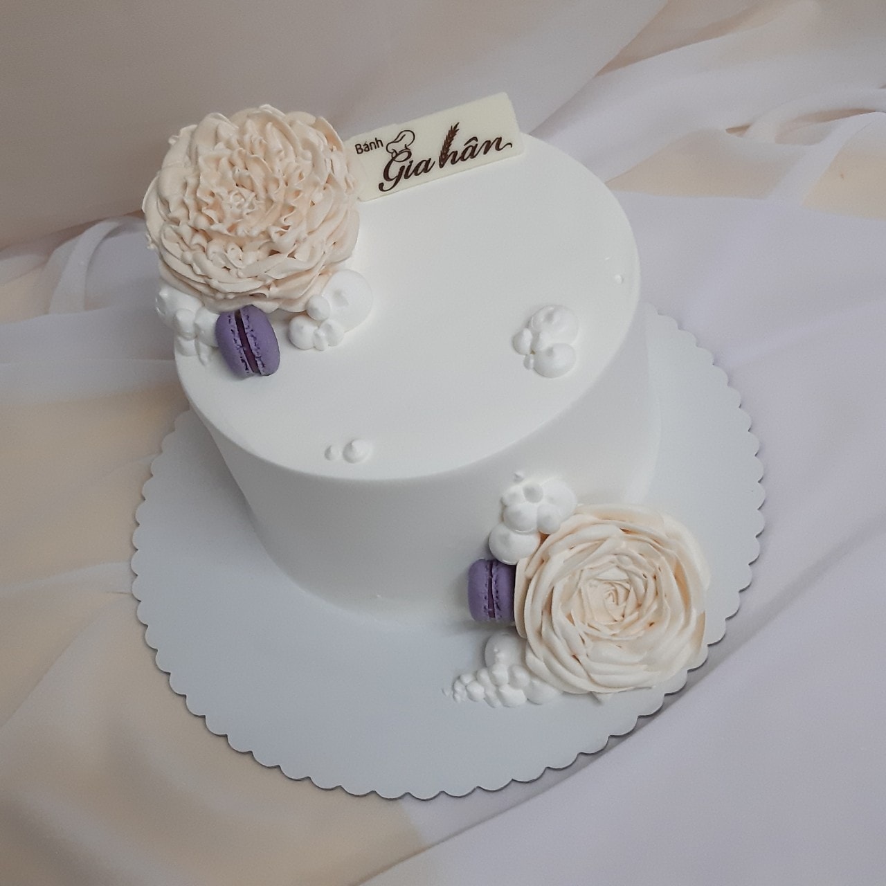 Trang trí hình hoa đơn giản và thêm bánh macaron màu đậm để không làm bánh kem trông quá ảm đạm